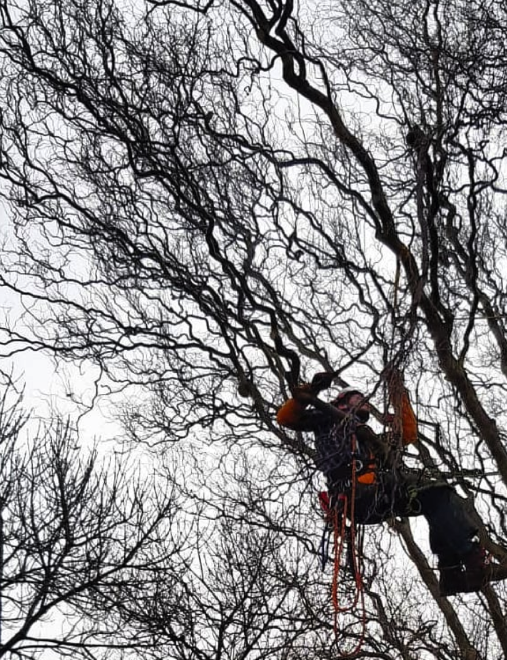 La taille sanitaire consiste à grimper dans l'arbre pour couper toutes les branches mortes, cassées ou fragiles pour éviter qu'elles ne finissent par tomber de manière inopinée sur des personnes, animaux, voitures, verrières, etc...
