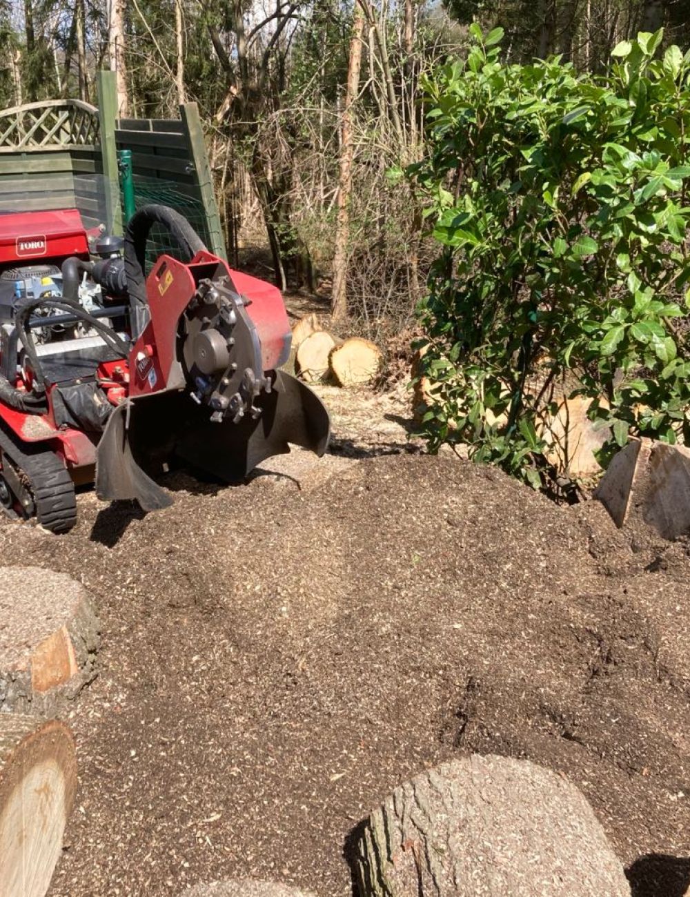 Après l'abattage d'arbre, nous procédons à l'essouchage avec une rogneuse de souche. Cela permet de faire totalement disparaître la souche et les racines. La dessoucheuse fraise la souche jusqu'à une profodeur suffisante pour d'éventuels aménagements ultérieurs ou pour aplanir le terrain où se trouvait l'arbre. On pourra par exemple y faire un pavage, replanter du gazon ou y replanter un arbre. Le rognage de souche limite l'impact sur les sols et les aménagements autour de la souche contrairement à un arrachage avec une excavatrice. Le fraisage de souche peut être réalisé sur des souches de toutes dimensions.